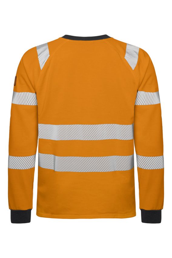 Non-Metal and Inherent Flame Retardant Hi-Vis T-shirt with long sleeves. PFAS-free fabric, where 50% of the cotton is recycled.